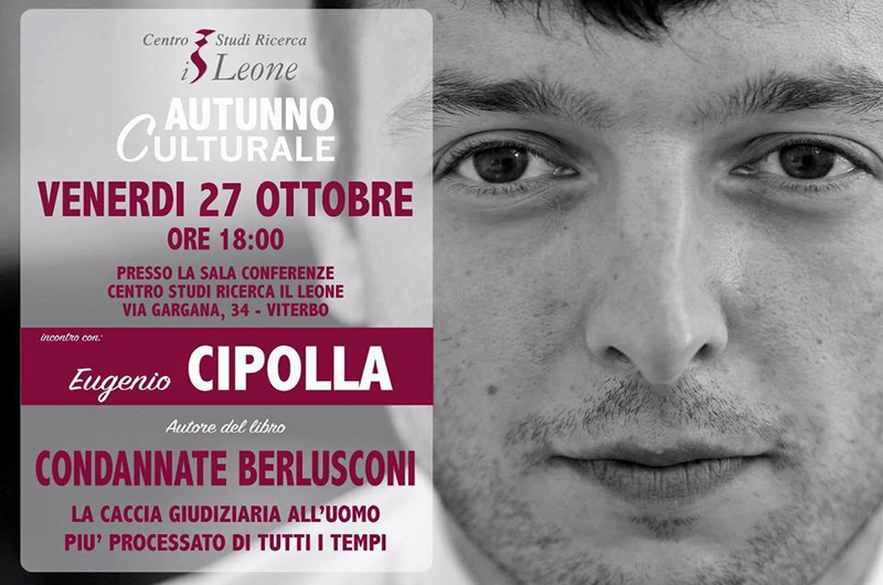 Il Centro Studi Ricerca Il Leone per l’Autunno Culturale organizza venerdì 27 ottobre alle ore 18.00 presso la propria sede in via Gargana 34 a Viterbo l’incontro con Eugenio Cipolla autore di “Presentazione del libro di Eugenio Cipolla “Condannate Berlusconi. La caccia giudiziaria all’uomo più processato di tutti i tempi” (l’ingresso è aperto a tutti)