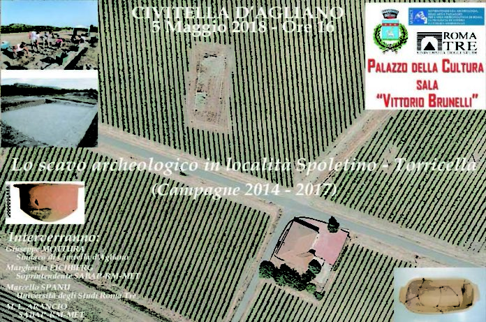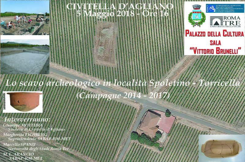 Sabato 5 maggio 2018, ore 16.00 a Civitella d’Agliano presso il Palazzo della Cultura, Sala Vittorio Brunelli si terrà la conferenza: Lo scavo archeologico in loc. Spoletino-Torricella Campagne 2014-2017.