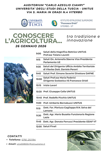 Lunedì 26 gennaio, dalle ore 9.00, presso l’Auditorium “Carlo Azeglio Ciampi” dell’Università della Tuscia, l’indirizzo Agrario dell’IIS “F. Orioli” di Viterbo organizza, in collaborazione con la facoltà di Agraria dell’Università della Tuscia, un convegno dal titolo “Conoscere l’Agricoltura: tra tradizione e innovazione”. L’evento nasce come un momento di approfondimento e riflessione sui temi centrali dell’agricoltura contemporanea, con l’obiettivo di favorire un confronto consapevole tra tradizione e innovazione.