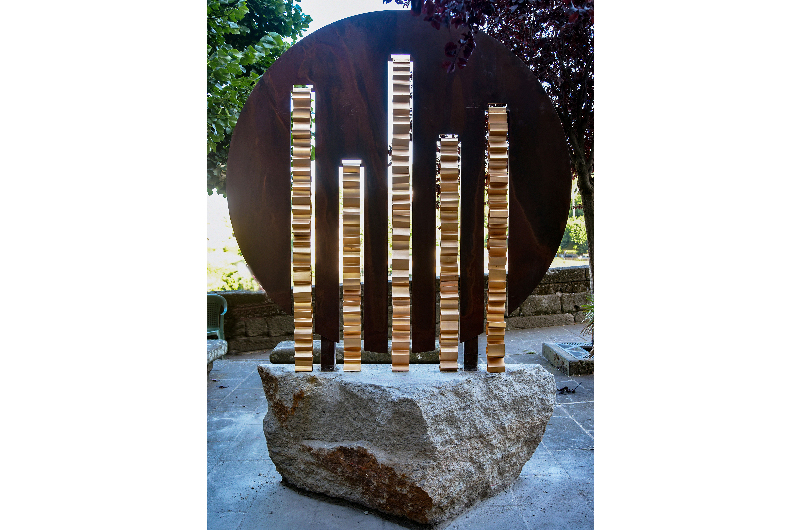 Ciò è rappresentato da lamine di bronzo sospese alla struttura che, come acqua, sembrano scorrere in un fluire incessante che è proprio del tempo.