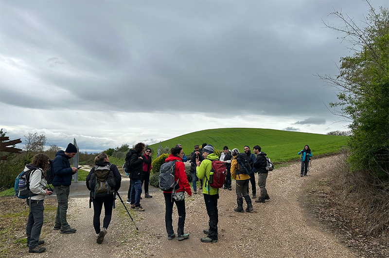L’addensarsi di minacciosissimi nembi, trasportati in cielo da quello stesso etereo e sfuggente elemento che ormai da mesi ha catturato la passione dei membri del collettivo, non ha scoraggiato il gruppo, guidato da Daniela Vinci di “Cammini percettivi”, dal percorrere i diciotto chilometri dell’itinerario Marta-Tuscania.
