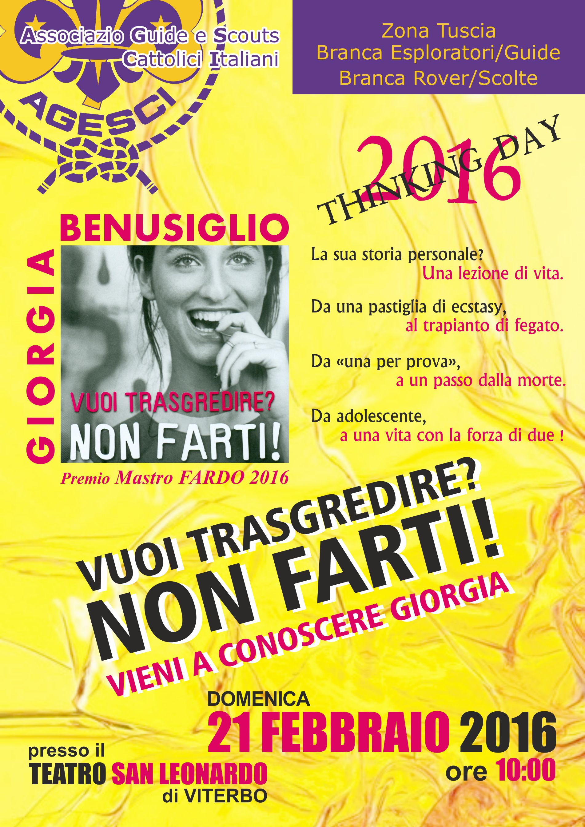 La sua storia personale? Una lezione di vita. Da una pastiglia di ecstasy al trapianto di fegato. Da una per prova ad un passo dalla morte. Da adolescente a una vita con la forza di due. È la storia di Giorgia Benusiglio, protagonista del convegno Vuoi trasgredire? Non farti! in programma a Viterbo domenica 21 febbraio alle 10 al Teatro San Leonardo di Viterbo per il Thinking Day 2016.