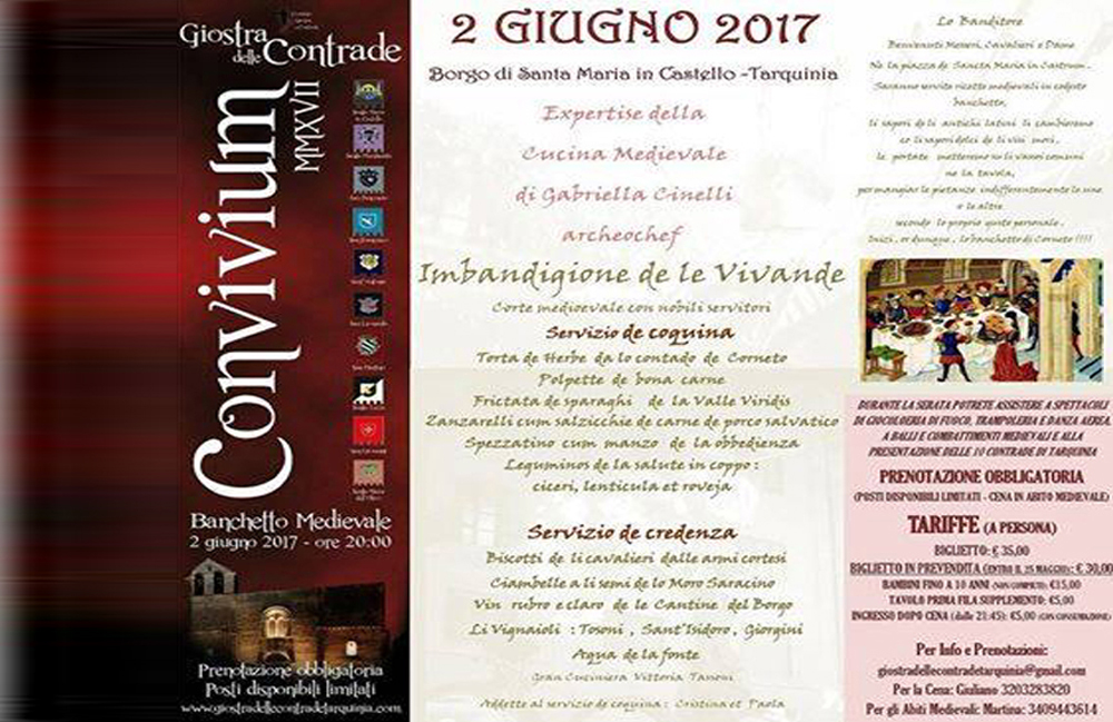 L’evento è ideato dal Comitato Giostra delle Contrade e realizzato in collaborazione con l’Associazione “Il Prezzemolino” di Vittoria Tassoni, chef e docente di cucina e membro dell’Associazione Cuoche a Domicilio, con Gabriella Cinelli, archeo-chef e docente master of food di Slow Food Italia e in collaborazione con l’Istituto Alberghiero di Caprarola e Pro Loco Tarquinia. I commensali saranno serviti da locandieri in costume medievale e potranno essi stessi indossare costumi d’epoca.