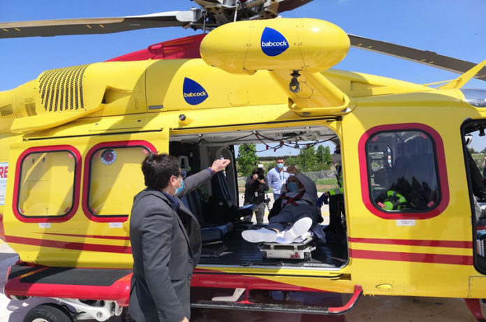 Nella foto:Vincenzo, il paziente di Bergamo, questa mattina è stato dimesso dal Campus Covid Center di Roma e torna dopo 50 giorni a casa a bordo di un elicottero dell’Areu.