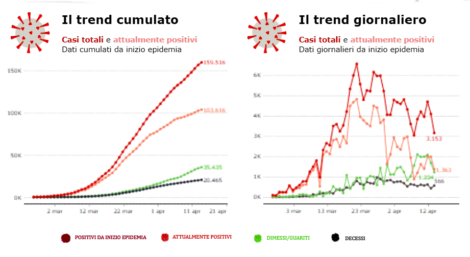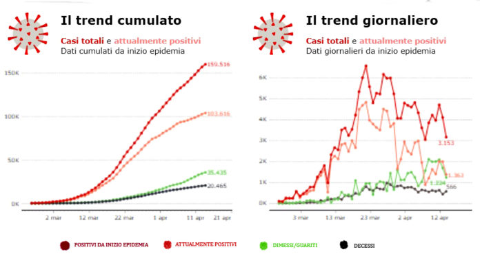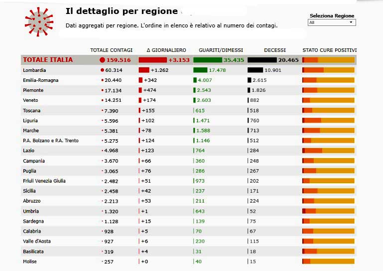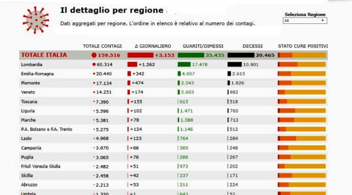 Sono 35.435 le persone guarite. I deceduti sono 20.465, ma questo numero potrà essere confermato solo dopo che l’Istituto Superiore di Sanità avrà stabilito la causa effettiva del decesso.
