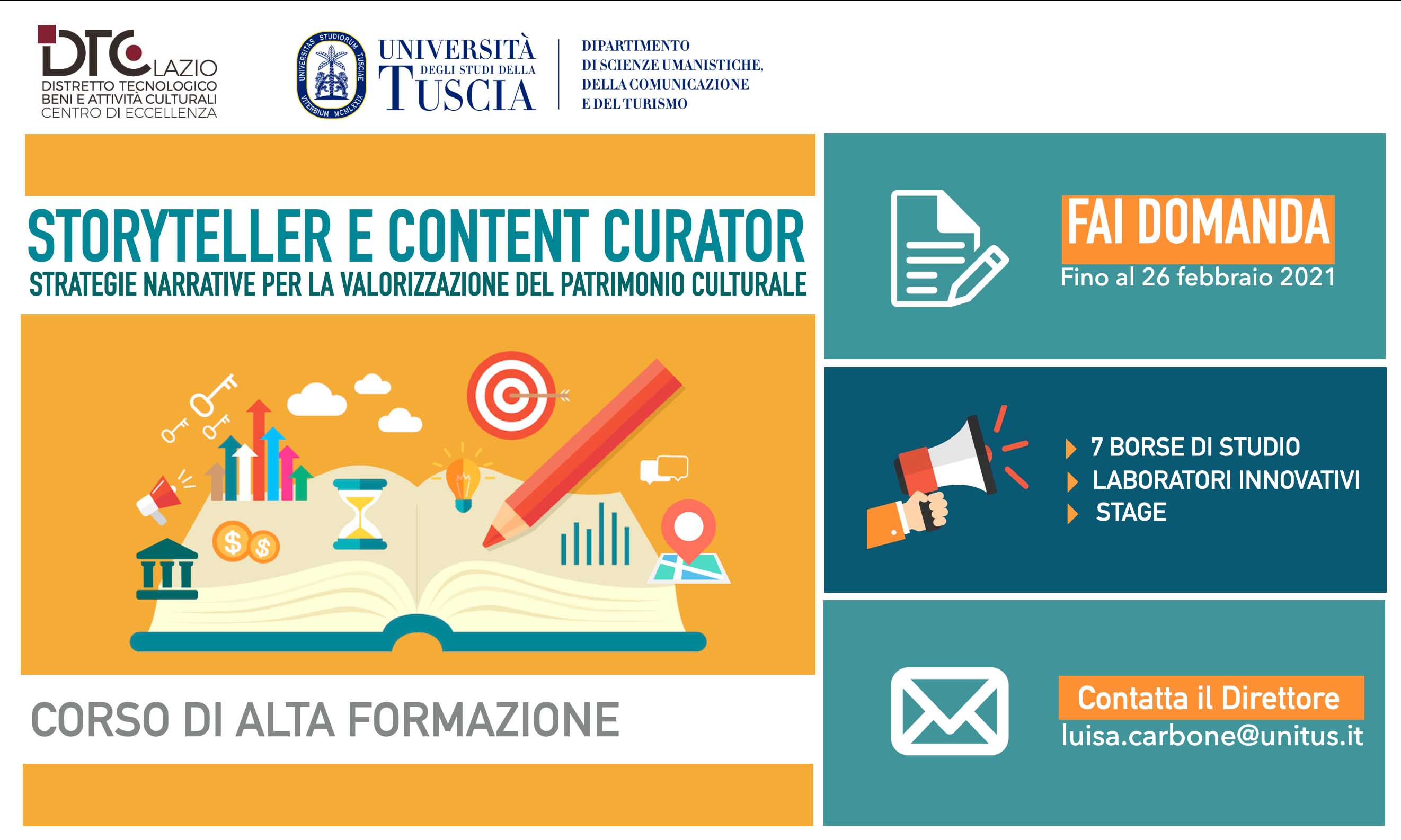 Per informazioni sul Corso di Alta Formazione in Storyteller e content curator strategie narrative per la valorizzazione del patrimonio culturale” luisa.carbone@unitus.it