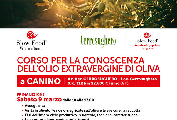 Sabato 9 marzo prenderà il via la prima delle due lezioni in cui si articola il Corso affascinante alla conoscenza del nostro oro verde. L’intero corso organizzato in collaborazione con la condotta di Slow Food Viterbo e Tuscia sarà tenuto da Stefano Asaro presso l’Az. Cerrosughero, a Canino, realtà importante nel mondo olivicolo della Tuscia, uno dei nostri portabandiera in Italia e nel mondo.