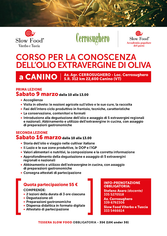 Qui si seguito le INFO dettagliate sul CORSO che si svolgerà presso l’oliveto e il frantoio dell’Az. Cerrosughero, in Località Cerrosughero, S.R. 312 km 22,600 a CANINO (VT)