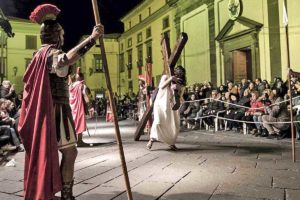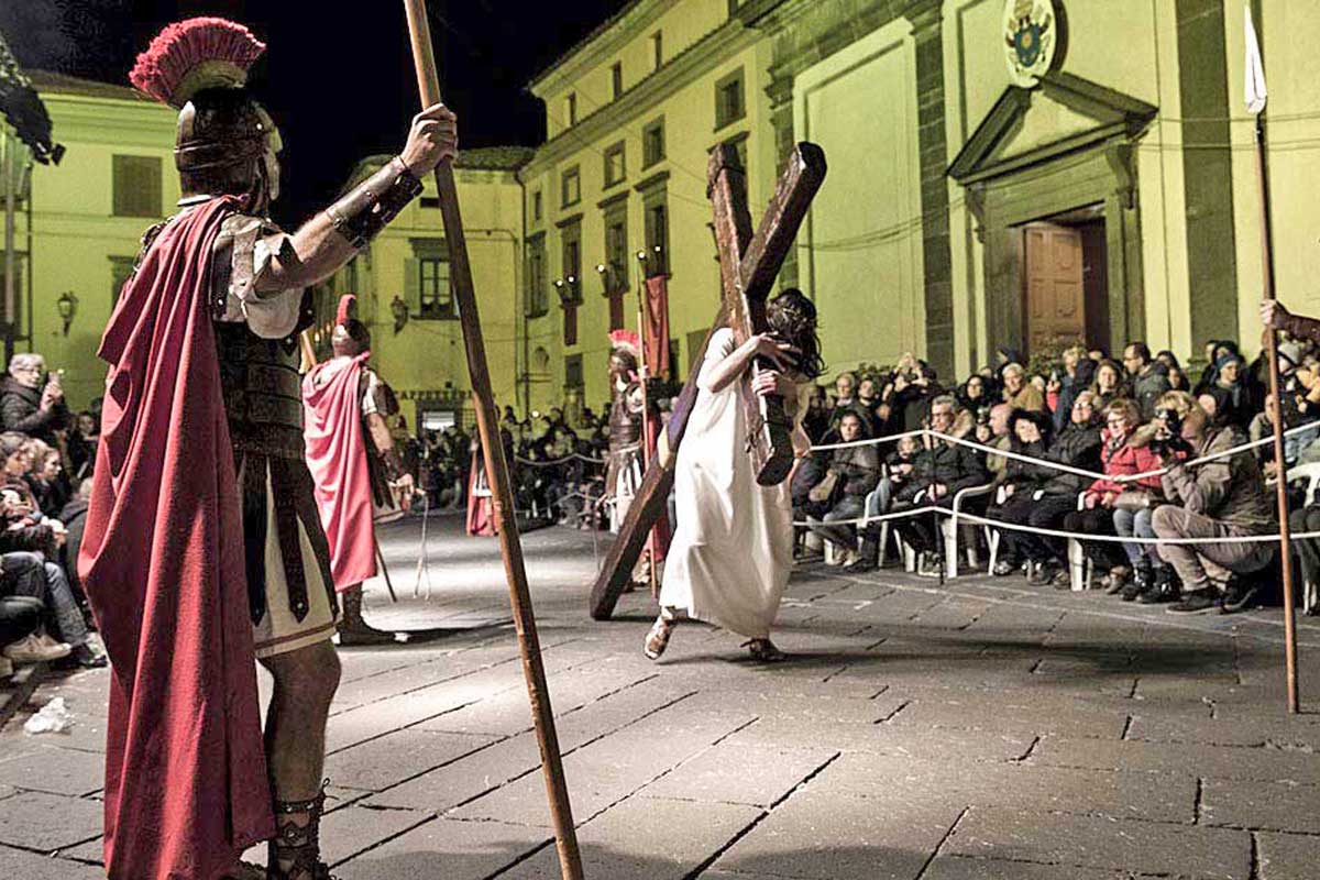 Una delle più importanti e conosciute in tutta la Tuscia è sicuramente “La processione del Venerdì Santo” a Bagnaia: una processione antica, organizzata ogni anno dal comitato permanente del Venerdì santo che prevede un lungo e dettagliato corteo della Via Crucis. I quadri escono dalla chiesa di San Giovanni Battista, passando per le vie del borgo, giungendo infine alle porte di Villa Lante, dove avviene la crocefissione. Oltre 400 figuranti, tanti i ragazzi e i bambini, 10 cavalli e 18 quadri che ogni anno rievocavano e raccontavano questo passaggio fondamentale per la fede cristiana: la passione di Cristo, la morte del venerdì santo ed il varco verso la resurrezione della Pasqua.