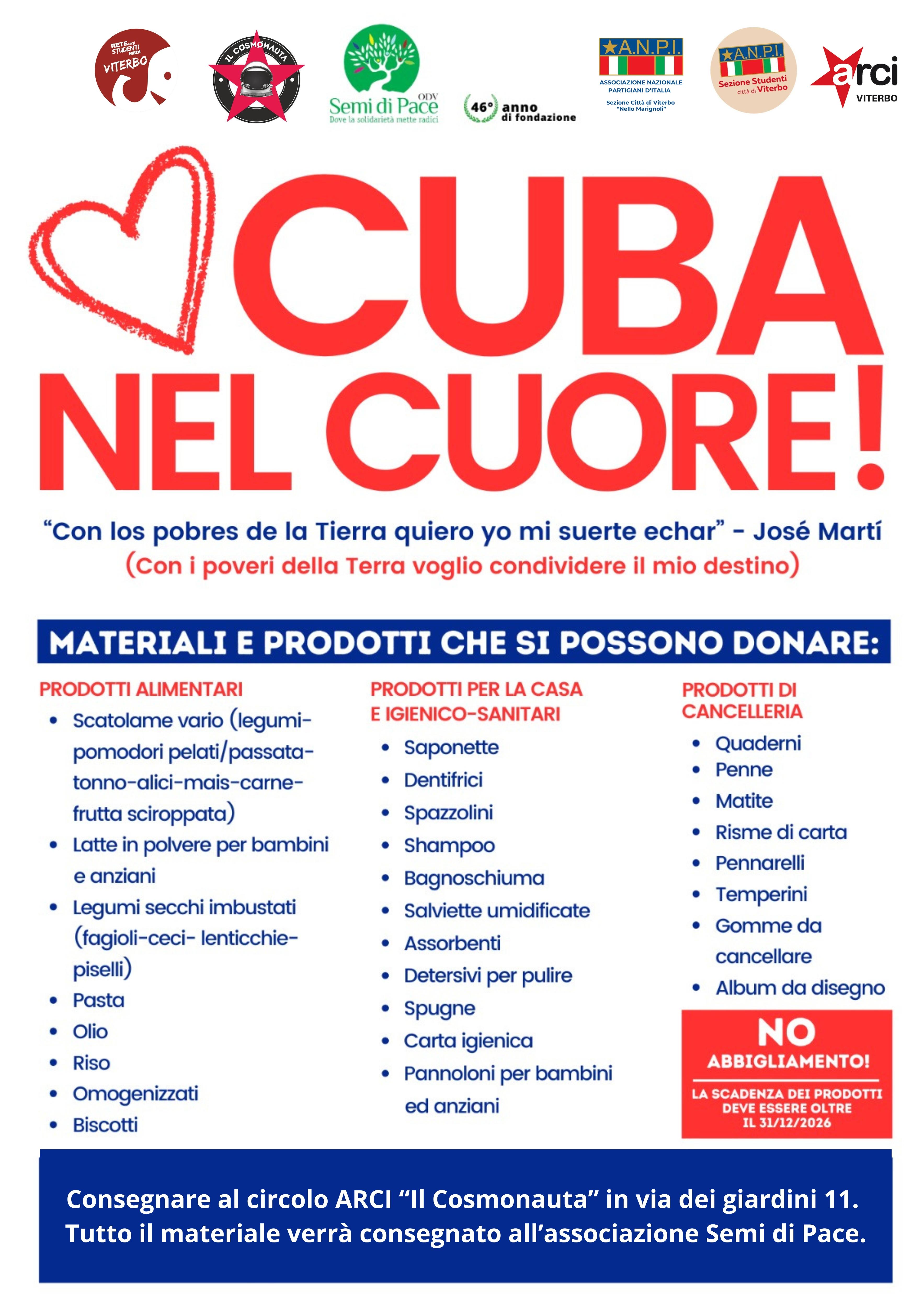 Per questi motivi le sezioni ANPI (Associazione nazionale partigiani d’Italia) di Viterbo e il Comitato provinciale ANPI aderiscono a una articolata rete nazionale di solidarietà che abbraccia il popolo cubano attraverso l’iniziativa “Cuba nel Cuore”, promossa dall’associazione Semi di Pace.