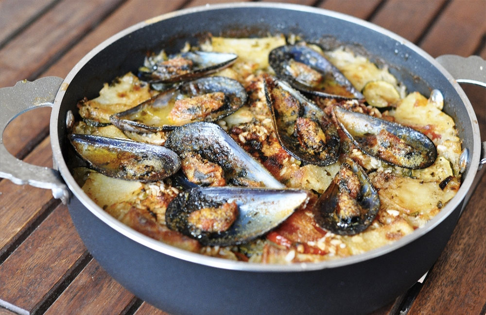 tritato, prezzemolo e peperoncino, quindi si irrora con il liquido delle cozze e con olio; si continua con un altro strato di patate, di riso e cozze, fino ad esaurimento degli ingredienti; l’ultimo strato, la copertura, deve essere di patate, insaporite con olio, sale e origano;