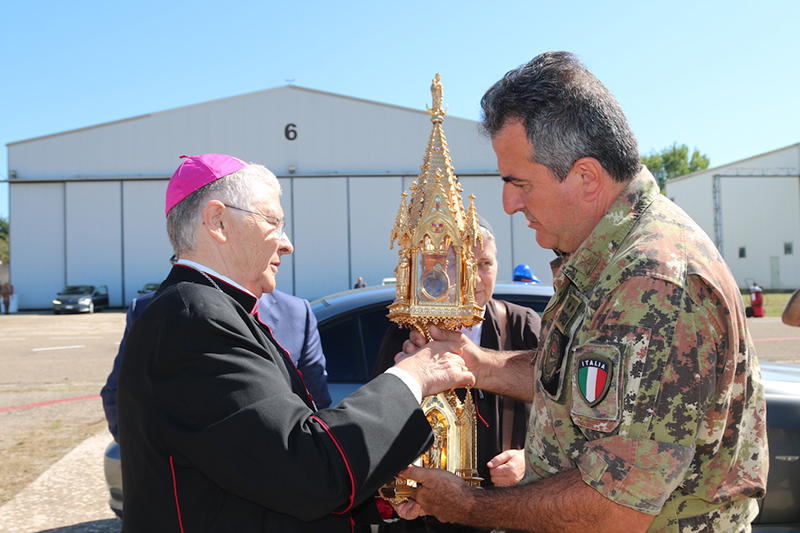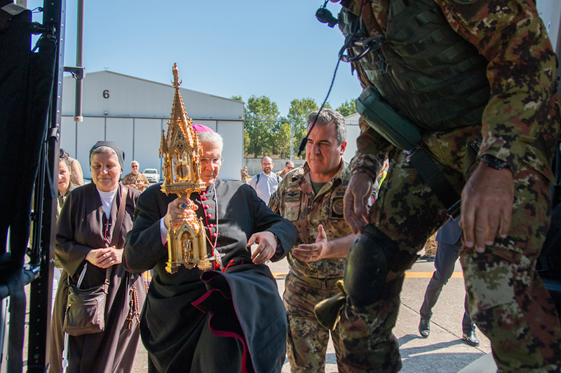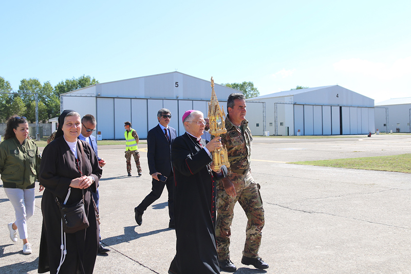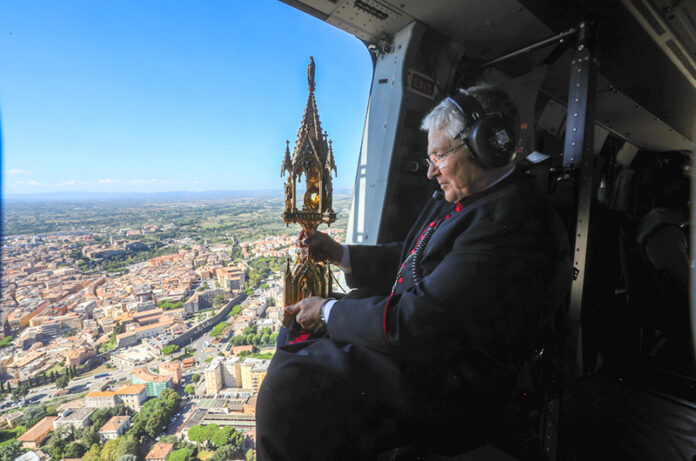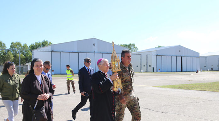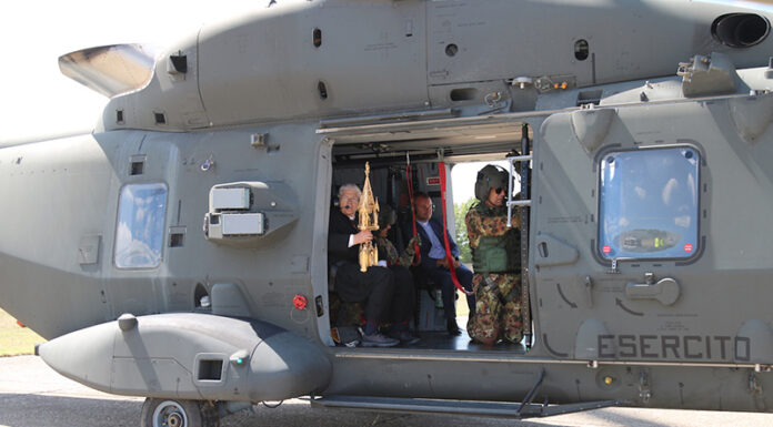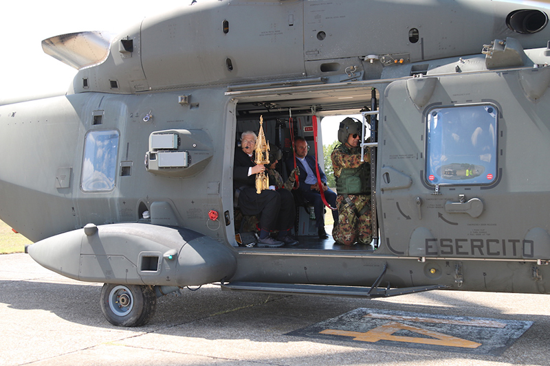 Il Vescovo di Viterbo S.E.R. Orazio Francesco Piazza con alcune delle principali autorità locali, si è recato presso l’eliporto Chelotti, dove l’elicottero NH-90, era pronto al decollo per compiere il sorvolo di Viterbo, Bagnaia, Grotte Santo Stefano, Soriano, San Martino al Cimino e Vitorchiano e i luoghi della fragilita, quali il Carcere, l’Ospedale Belcolle e le cliniche di malati e anziani.