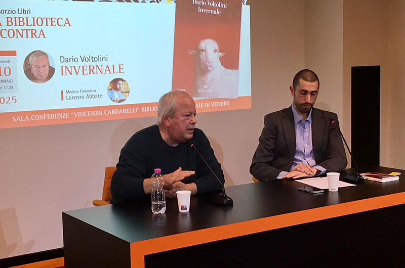 Venerdì dì 10 gennaio pomeriggio la Biblioteca consorziale di Viterbo ha ospitato lo scrittore Dario Voltolini, con il quale è ripartita la rassegna “La Biblioteca incontra” di questo anno 2025. Lo scrittore con il suo romanzo “Invernale” (La nave di Teseo), finalista al Premio Strega 2024, ha dialogato con l’eccellente storico dell’arte Lorenzo Abbate. Dario Voltolini con le sue parole ci riporta il rumore delle voci al mercato, le sue descrizioni scintillanti, capaci di afferrare le cose e suscitarle come nessun altro, insieme al  bravo moderatore ha attraversato i passi di un romanzo coinvolgente, in cui fa i conti con la scomparsa del padre, una descrizione resa intensa soprattutto nel suo epilogo pieno di pathos di intensa commozione. Una presentazione che è riuscita ad affascinare il numeroso pubblico della Biblioteca di Viterbo. Un numero di copie del libro è stata, come sempre, fatta omaggio a parte del pubblico presente. (LucPas)