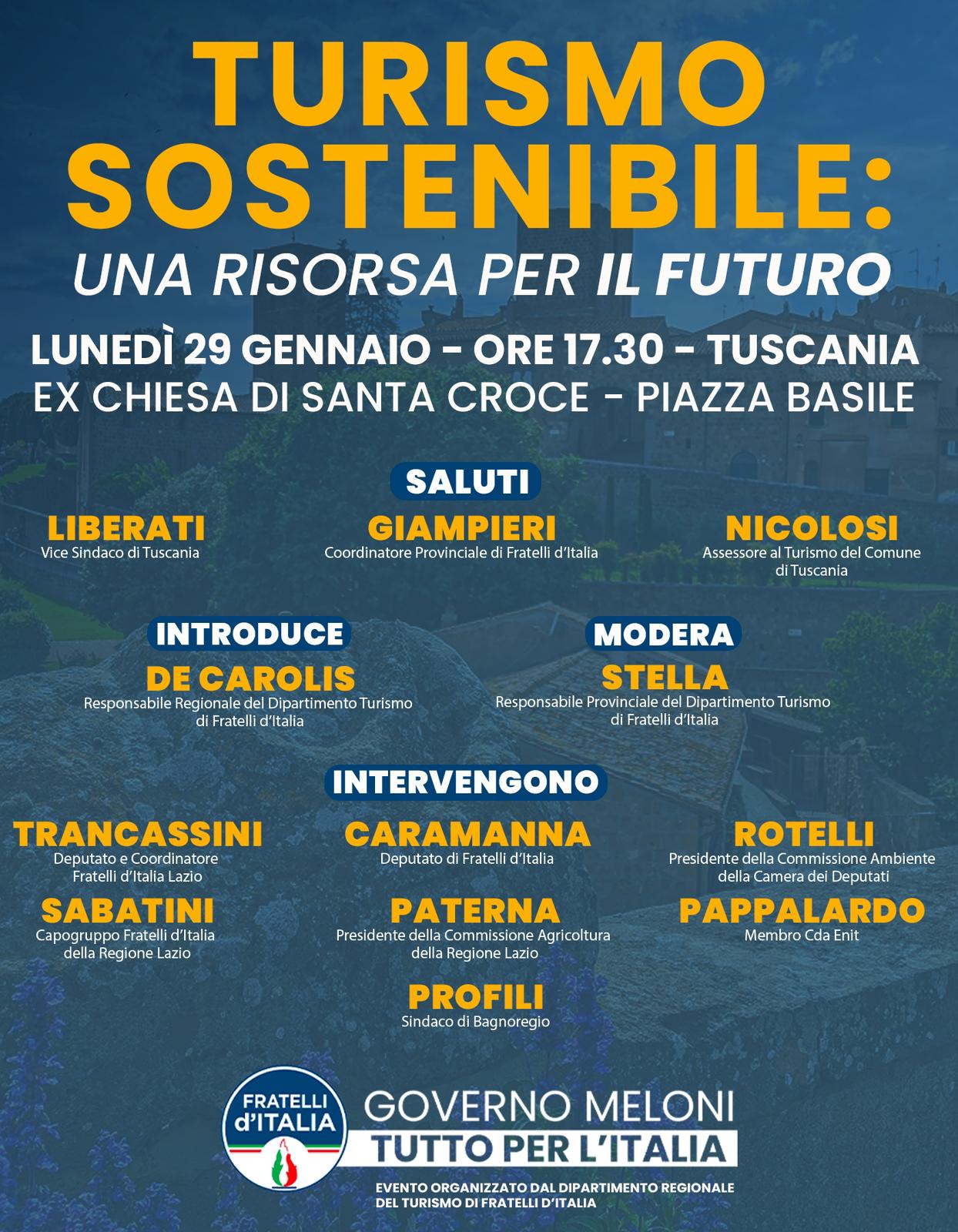 Allincontro parteciperanno gli on.li Caramanna (Resp. Naz. Turismo FdI), Trancassini (Segr. FdI Lazio), Rotelli (Presidente della Commissione Ambiente della Camera dei Deputati), Sabatini (Capogruppo FDI Regione Lazio), Paterna (Presidente della Commissione Agricoltura della Regione Lazio), il sindaco di Bagnoregio Profili e il membro del Cda di Enit Pappalardo, il vicesindaco di Tuscania, Liberati, lassessore al Turismo, Nicolosi e il coordinatore provinciale Giampieri. Coordinerà i lavori, Emanuela Stella, resp. Del Dipartimento Turismo FdI della provincia di Viterbo.