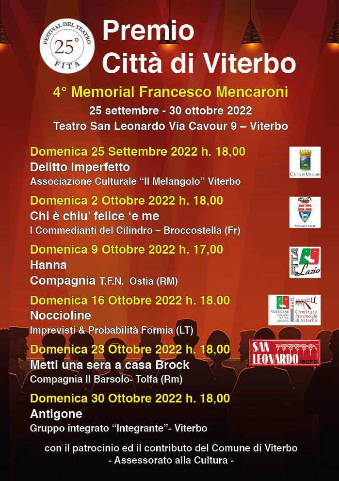 Al via domenica 25 settembre alle ore 18, la venticinquesima edizione del festival del Teatro FITA – Premio Città di Viterbo e quarto Memorial Francesco Mencaroni. La manifestazione si aprirà con lo spettacolo Delitto imperfetto, portato in scena dall’associazione Il Melangolo di Viterbo. Sei gli appuntamenti in programma fino al prossimo 30 ottobre, il palcoscenico sarà quello del Teatro San Leonardo (via Cavour).