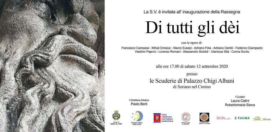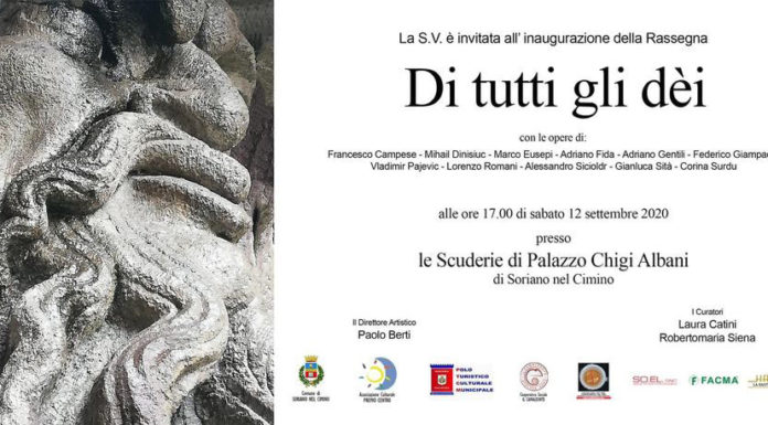 Il 12 settembre 2020, alle ore 17.00, presso le Scuderie di Palazzo Chigi Albani, inaugura la Rassegna d’arte per il Comune di Soriano nel Cimino (VT) Di tutti gli dèi, curata da Laura Catini e da Robertomaria Siena, con la Direzione artistica di Paolo Berti e realizzata grazie al supporto organizzativo dell’Associazione Culturale Premio Centro, del Polo Turistico Culturale locale, e al Patrocinio del Comune di Soriano, con il sostegno del Sindaco Fabio Menicacci e dell’Assessore alla Cultura Rachele Chiani. L’evento rievoca in chiave contemporanea, una presenza storica e legata alla località di Soriano, quella sacra-mitologica. La prima testimonianza scritta di Soriano nel Cimino appare, infatti, con Tito Livio che, nella sua opera Ab Urbe condita, nel 443 a.C., narra come, durante la guerra contro gli Etruschi, l’agglomerato urbano dell’antica “Surrina” fu invaso dalle milizie romane del Console Quinto Fabio Massimo Rulliano che, dopo numerose difficoltà, era riuscito ad attraversare la Selva Cimina. Il monte Cimino sovrasta il suo centro abitato e ha, sulla sommità, una faggeta secolare di circa 57 ettari, la più maestosa e imponente del Centro Italia. La Selva Cimina era tanto fitta da apparire luogo sacro, impenetrabile e tetro agli occhi degli antichi. Il vasto territorio comunale è poi costellato da resti di torri, castelli, catacombe paleocristiane, chiese medievali, insediamenti ipogei e tracce del passaggio dell’uomo, fin dalla notte dei tempi. Nei monti Cimini, oltre a numerose tracce di insediamenti protostorici, risalenti a periodi anche antecedenti o coevi all’età del bronzo, sono stati ritrovati antichi resti di templi probabilmente dedicati a Giove Cimino.