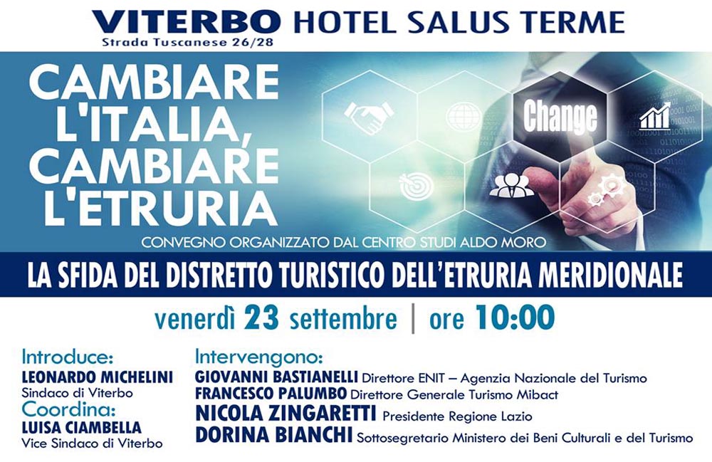 La sfida del distretto turistico dell’Etruria meridionale è il tema che apre la due giorni all’Hotel Salus di Viterbo organizzata, dal Centro Studi Aldo Moro di cui è referente l’Onorevole Giuseppe Fioroni già presidente Commissione Parlamentare sul caso Moro .S’inizierà venerdì 23 settembre ore 10,00. Nella stessa giornata alle ore 15,00 si parlerà anche di referendum costituzionale con la ministra Maria Elena Boschi.I lavori si concluderanno il 24 mattina affrontando il tema della sicurezza contro il terrorismo, aprirà il dibattito l’Onorevole Fioroni.