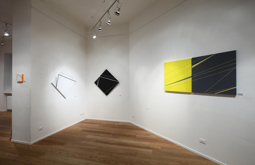 In ogni tela, l’artista elabora composizioni sintetiche, dove linee nette si moltiplicano tagliando la superficie in forme a volte scomposte e irregolari, a volte più precise e regolari.