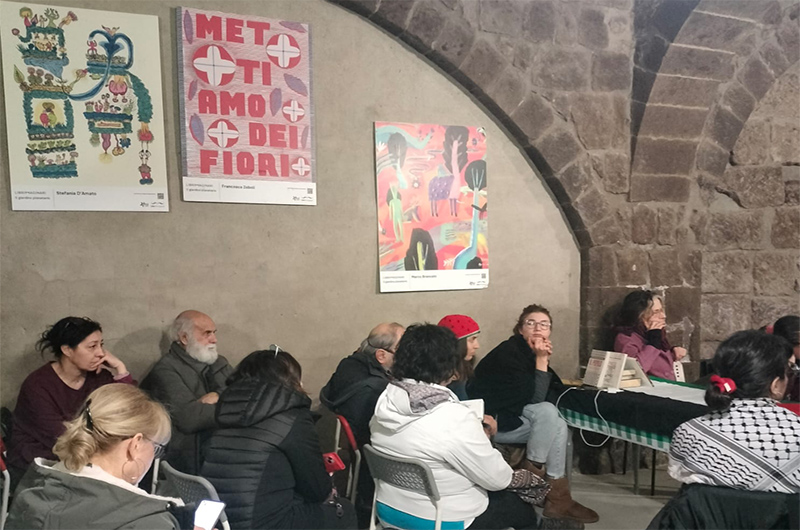 Per concludere, Sandra Gasbarri, in rappresentanza di Arci Viterbo: “Grazie a Marcella Brancaforte, che ha portato la sua mostra in molti circoli d’Italia e che ha organizzato questo incontro con Hassan. L’Arci in questo periodo si sta confrontando per far in modo di non disperdere la comunità che si è creata in questi mesi. I circoli dei Cimini, uniti in ‘Tuscia per la Palestina’, hanno dato vita a molte iniziative nei mesi passati, culminate con la fiaccolata a Ronciglione, a cui hanno partecipato tutti i Comuni del comprensorio che hanno riconosciuto lo Stato di Palestina. Partendo dall’esperienza di Vitorchiano con il villaggio palestinese di Aboud, anche loro stanno avviando dei gemellaggi. Mentre al Comune di Viterbo, purtroppo, tutto tace. Per questo continuiamo a presenziare in piazza del Comune. Lo scopo del presidio è quello di essere visivamente presenti, cercando di tematizzare le giornate d’incontro con argomenti che possano coinvolgere e interessare le persone che durante queste feste popolano il centro della città”.