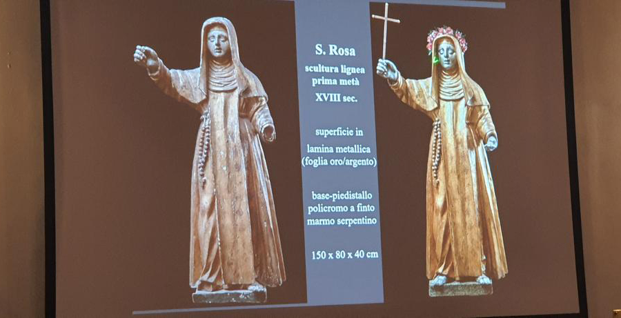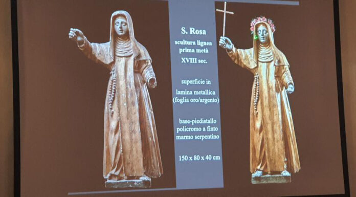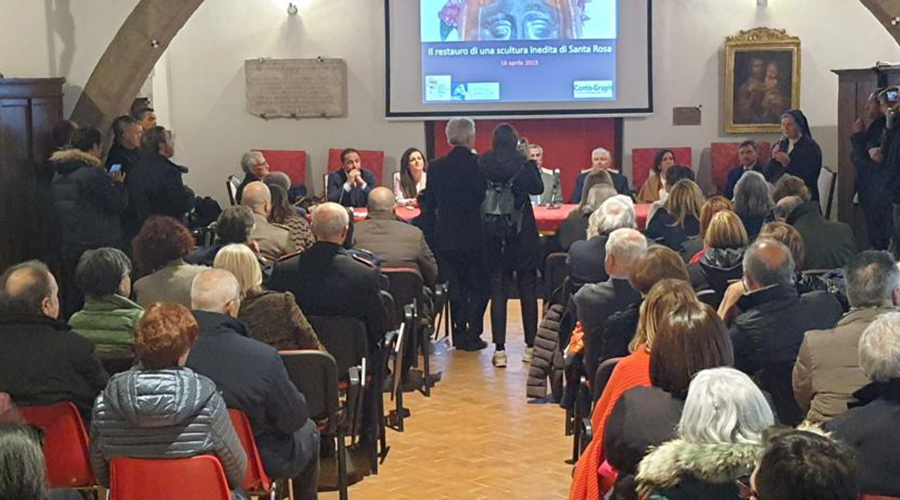 Dopo tre secoli “Rosina” torna a casa: bellissima e pure austera nella sua veste lignea, ritoccata e rivitalizzata. Alle 18 di domenica la statua settecentesca viene liberata dai veli che l’hanno delicatamente avvolta fino a poco prima. Il vescovo Francesco Piazza e la sindaca Chiara Frontini a presiedere alla cerimonia, seguita alla illustrazione della preziosa icona e del suo restauro, realizzato dal professor Giorgio Capriotti dell’Università della Tuscia. Restauro reso possibile da una joint venture, pubblico-privata, tra l’amministrazione comunale di Viterbo e l’imprenditore telesino-viterbese, Antonio Di Pietro. La sala conferenze del monastero registra il sold out: presenti, tra gli altri, anche il sindaco di Telese e il presidente del Tribunale di Viterbo. La statua risale alla prima metà del XVIII° secolo e faceva parte di un complesso ligneo che comprendeva tre sculture della santa: la prima è ospitata presso la casa di Santa Rosa, la seconda è quella tornata nel monastero, la terza si trova nell’episcopato del palazzo Papale. E attende di essere anch’essa restaurata. Meritevole l’opera di recupero alla quale hanno contribuito generosamente alcuni detenuti di Mammagialla che hanno eseguito la corona di rose che ora adorna il capo di “Rosina”. E nel nome di Santa Rosa potrebbe essere costruito un gemellaggio tra la nostra e la citta omonima di santa Rosa che si trova in Colombia. “Ci stiamo lavorando insieme al vescovo Francesco, siamo determinati ad arrivare in tempi brevi all’obiettivo”, annuncia l’ambasciatrice colombiana in Italia. Un gemellaggio che farebbe il paio tra Viterbo e Telese, due città accomunate da una stessa ricchezza, quella delle acque termali. I due primi cittadini confermano: “Perché no? Si può fare”. (L. C.)