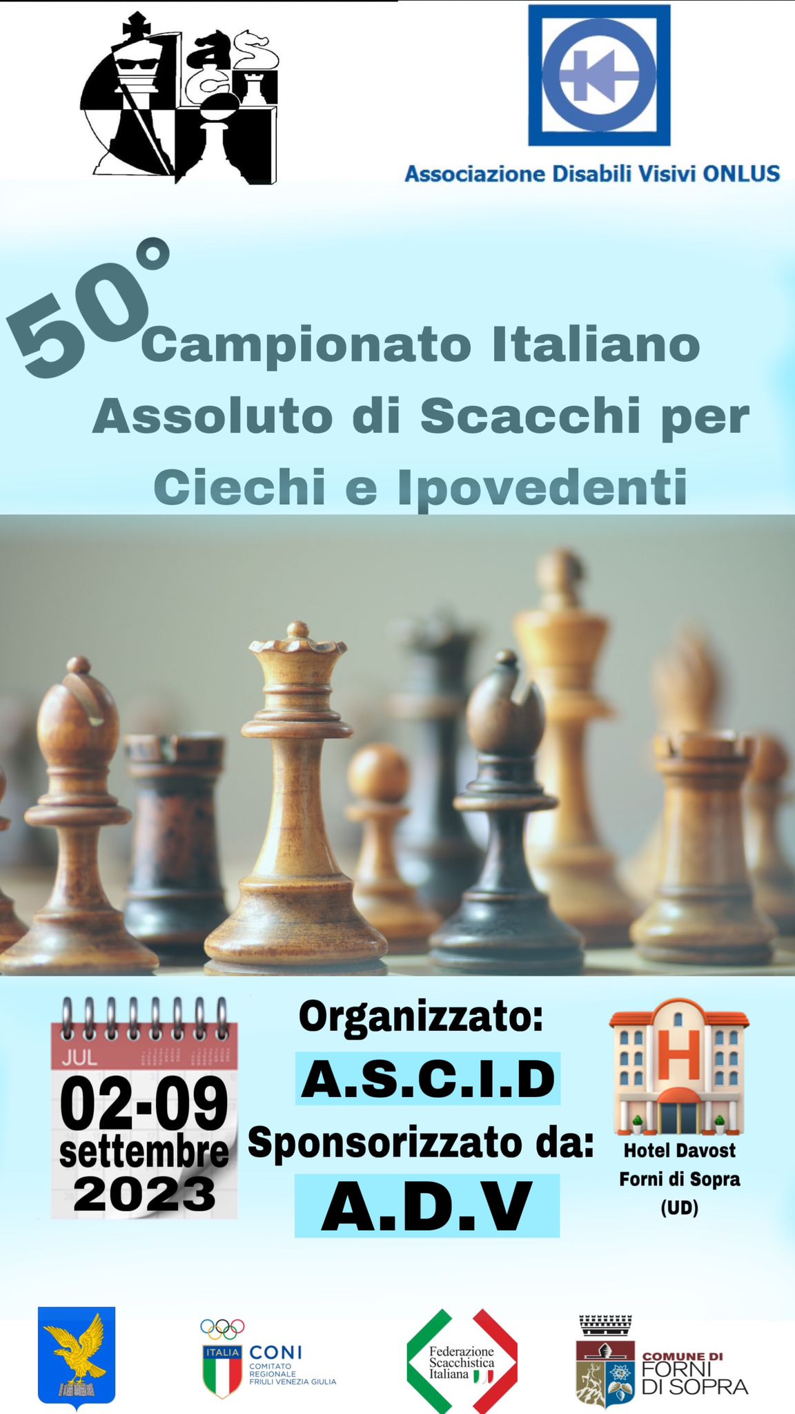 Dal 2 al 9 settembre l’Associazione Scacchisti Ciechi Italiani dilettantistica (A.S.C.I.d.) ha celebrato la 50° Edizione del Campionato italiano Assoluto di Scacchi per Ciechi e Ipovedenti presso l’Hotel Davost, Forni di Sopra (UD). Sponsorizzata dall’Associazione Disabili Visivi (ADV), la Manifestazione ha goduto del Patrocinio del Comune di Forni di Sopra, della Regione Friuli Venezia Giulia, della Federazione Scacchistica Italiana (FSI) e del Comitato CONI Friuli Venezia Giulia.