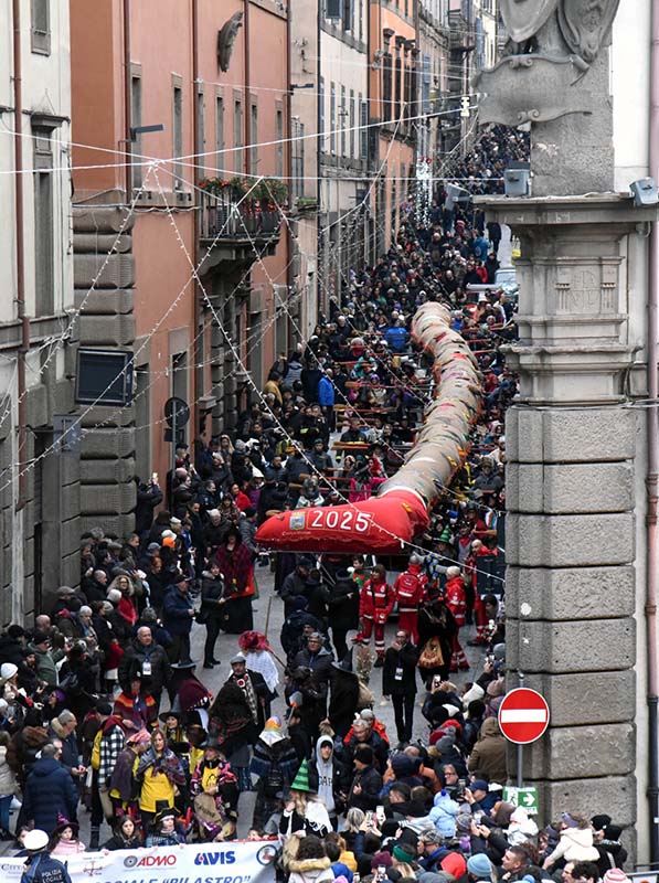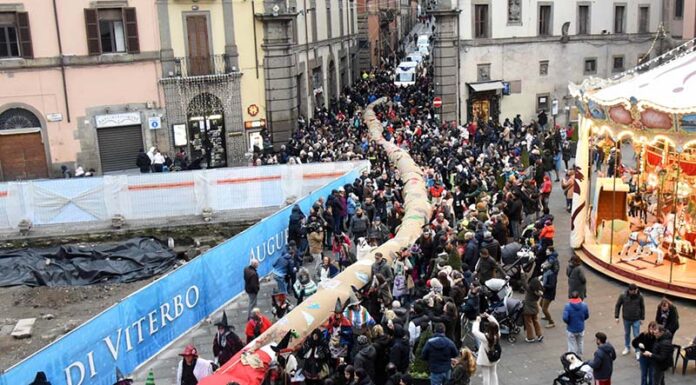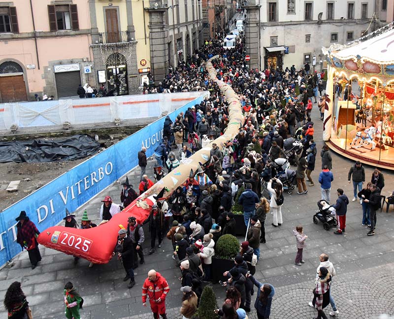 Le previsioni meteo instabili non hanno per nulla intimidito Luciano Barozzi presidente del Centro sociale Pilastro che nella tarda mattinata ha rassicurato cittadini e appassionati della Calza da Guiness dei Primati , che l’evento  era confermato. L’allineamento a San Sisto alle 15.45 dove  si è delineata la partenza. In prima fila tra le oltre  cento volontarie hanno fatto il loro esordio anche le giovani Befane, del resto la sindaca ha fatto appello fino all’ultimo momento affinchè facessero il loro ingresso a sostegno di una tradizione ormai radicata negli eventi storici della città. 52 metri di lunghezza ne stabiliscono il record, accompagnata da quindici storiche 500, dalla Banda Città di Viterbo, e dai Gruppi dei Musici e Sbandieratori del quartire Pilastro. La manifestazione promossa e organizzata dal centro sociale Pilastro, in collaborazione con Admo, Avis, 500 Tuscia Club di Viterbo e la Parrocchia del Sacro Cuore, si avvale del patrocinio e il contributo del comune di Viterbo, assessorati politiche sociali e cultura organizzatore dell’Evento patrocinato pure dal Comune di Viterbo.Tra le Befane la prima cittadina Chiara Frontini. Il percorso rispettato  da programma sino al capolinea al sagrato della Chiesa del Sacro Cuore,dove la calza è stata depositata, lì ad attenderla  in trepidante attesa tanti bambini che hanno ricevuto dolci.Protagoniste della giornata, insieme alla gigantesca calza, sono state le tantissime Befane, che hanno sfilato distribuendo dolci e sorrisi a grandi e piccini! Molte  le iniziative di solidarietà ad essa collegate. La Calza della Befana ha sfidato la pioggia, con allegria facendo da apripista a tutte le Befane che saranno  in azione scendendo da torri e comignoli con tante dolcezze e poco carbone (speriamo) protagoniste nella giornata del 6 gennaio. Ricordiamo l’evento clou alle ore 15.00 con la Befana115 dei Vigili del Fuoco a partire dalle ore 15,30 e fino alle ore 20,a piazza della Rocca  per un pomeriggio dedicato alla simpatica vecchietta. Fino alle ore 20 sarà un susseguirsi di iniziative, con il momento all’apice alle ore 18 circa, nel quale la Befana si calerà dall’alto per la gioia dei bimbi presenti.  In questa edizione la vecchietta  si sposta a piazza della Rocca, al posto della consueta Piazza del Plebiscito con cantiere aperto per il PNRR.E il week end lungo si chiude.