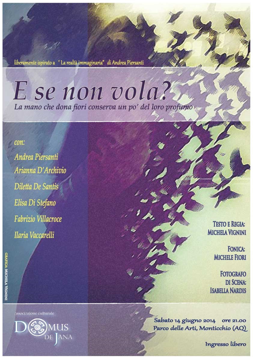 A portare in scena lo spettacolo saranno Andrea Piersanti, Arianna D’Archivio, Diletta De Santis, Elisa Di Stefano, Fabrizio Villacroce e Ilaria Vaccarelli diretti da Michela Vignini. La regista nata a L’Aquila gira l’Italia tra festival teatrali e teatro di strada. Dal 2005 conduce corsi di teatro presso il Teatro Dedalus a L’Aquila. Ed è dal corso che nasce è nata la compagnia “Domus de Jana” composta da giovani attrici ed attori, dalla quale è nato lo spettacolo “E se non vola?”.