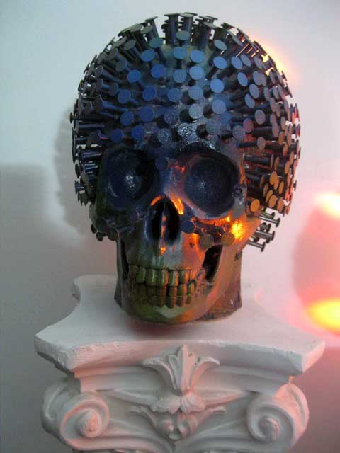 Guadagnuolo operante tra Roma e New York rende visibile al mondo il Coronavirus e lo fa con una scultura-installazione, un cranio coronato di particolari forme a punta che circondano le particelle virali. Dunque eccellenze nella medicina italiana come anche nell’arte visiva. L’arte si sa, sin dai tempi di Leonardo Da Vinci si è interessata di scienza, Guadagnuolo, in questa sua indagine culturale neo-umanista, produce un’arte contemporanea che coopera e dispone il sistema con cui discerniamo il creato.