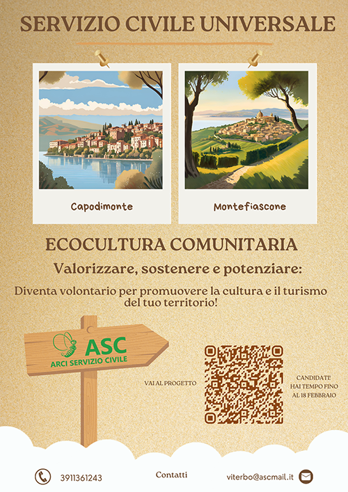 Parte Ecocultura Comunitaria, il progetto ideato dai Comuni di Montefiascone e Capodimonte che si propone di valorizzare i rispettivi patrimoni culturali e naturalistici attraverso attività di servizio civile promossa tra ragazzi e giovani, agevolando così la partecipazione, la solidarietà e l’inclusione a beneficio sia personale delle nuove generazioni sia della comunità locali e dello sviluppo del territorio.
