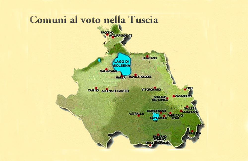 Questi i 21 Comuni della Tuscia e i relativi sindaci uscenti, che il prossimo 5 giugno rinnoveranno le proprie amministrazioni: