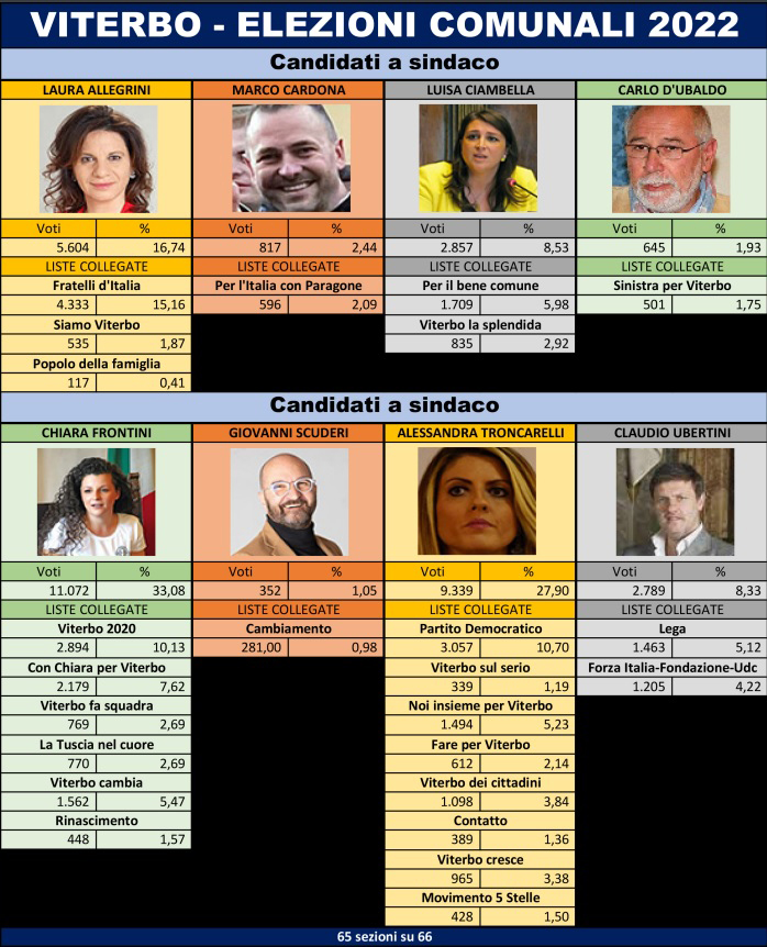 Dunque, al ballottaggio (ampiamente previsto, visto il numero di candidati a primo cittadino) andranno due donne, con una conseguente certezza inequivocabile: il prossimo sindaco di Viterbo sarà una sindaca. Una tra Chiara Frontini e Alessandra Troncarelli. Gli altri sei candidati, vale a dire Laura Allegrini, Luisa Ciambella, Claudio Ubertini, Marco Cardona, Carlo D’Ubaldo, Giovanni Scuderi saranno alle prese con possibili alleanze con una delle due vincitrici per spuntare qualche seggio in più. Fino a domenica 26 giugno, giorno del giudizio finale.