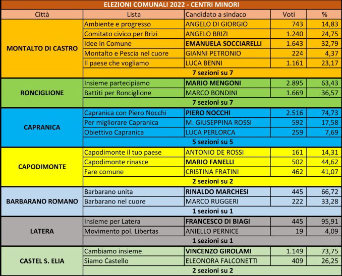 I sindaci eletti negli altri sette comunia Montalto ha vinto Adriana Socciarelli, a Ronciglione Mario Mengoni, a Capranica Piero Nocchi, a Capodimonte Mario Fanelli, a Barbarano Romano Rinaldo Marchesi, a Latera Francesco Di Biagi e a Castel S. Elia Vincenzo Girolami.