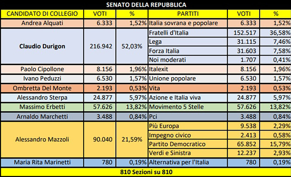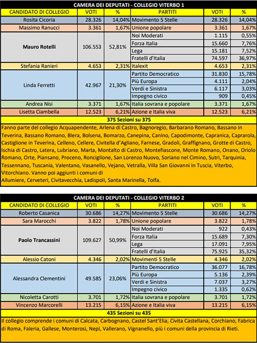 Le tabelle definitive per la Camera e per il Senato si allineano anche nella Tuscia con l’andamento nazionale. Il centrodestra vince le elezioni politiche, ha la maggioranza sia alla Camera sia al Senato, con Fratelli d’Italia primo partito.