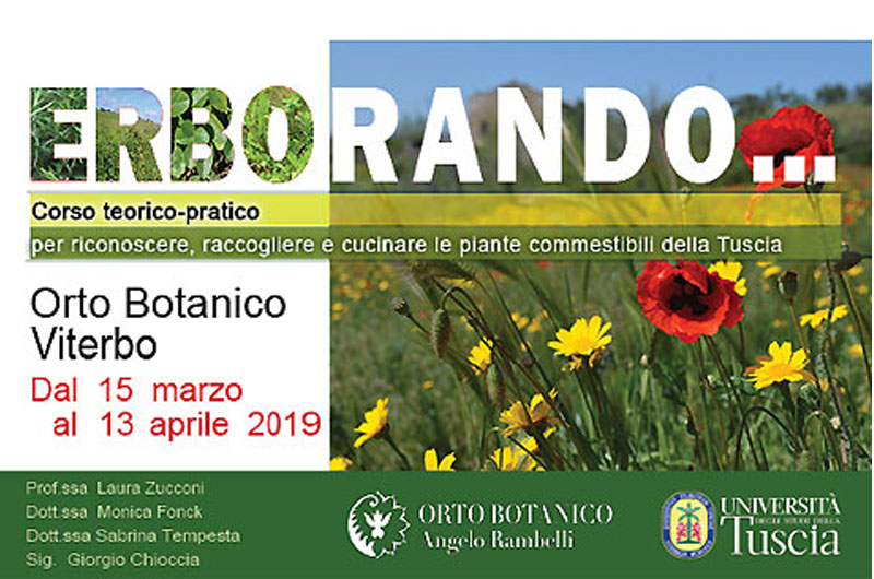 Il corso Erborando sarà tenuto dalla professoressa Laura Zucconi, dalle dottoresse Monica Fonck, Sabrina Tempesta e da Giorgio Chioccia e, come ogni anno, si concluderà con la consegna degli attestati, con uno show cooking e con la degustazione di un pasto ‘selvatico’, cioè fatto con le erbe spontanee di cui si sarà parlato durante gli incontri. A prepararlo sarà lo chef Maurizio Esposito.