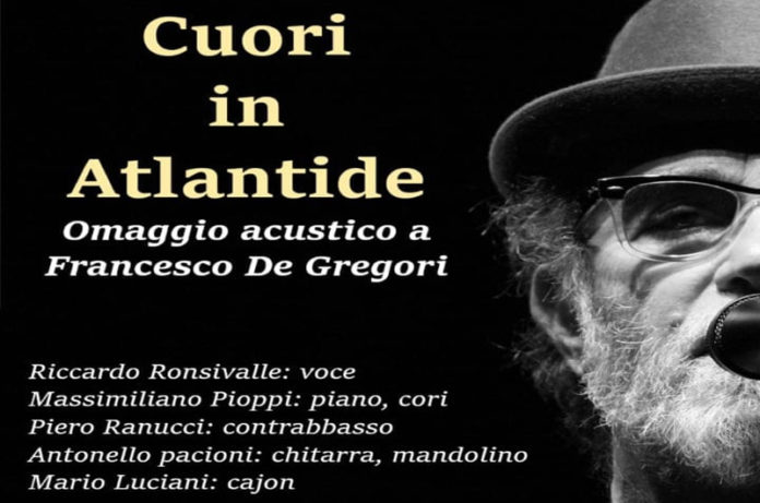 Venerdi 12 luglio approdano a Bomarzo i “Cuori in Atlantide-omaggio a Francesco De Gregori”, questo il nome completo della band di recente costituzione che interpreta i classici più e meno noti del raffinato cantautore romano. Una formazione recente che, tuttavia, annovera al suo interno talentuosi musicisti di lungo corso Cuori in Atlantide nasce infatti da un’idea di Massimiliano Pioppi e Antonello Pacioni (rispettivamente pianista e chitarrista degli Hotel Supramonte), e prende forma definitiva in seguito all’incontro con il cantautore e interprete Riccardo Ronsivalle, la cui collaborazione con Massimiliano Pioppi si estende anche al progetto Pafff Bum… Ricordando Lucio Dalla.