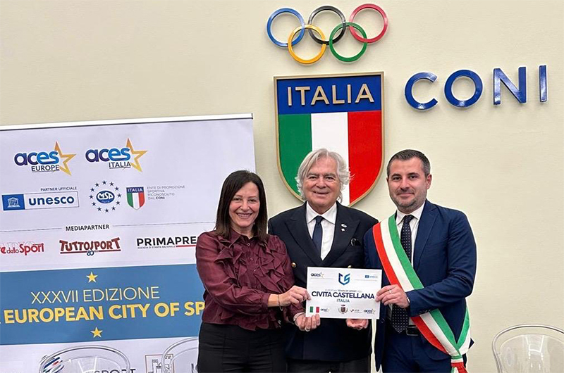 Civita Castellana protagonista il 10 novembre alla XXXVII edizione del Gala European City of Sport, organizzato a Roma nel salone d’onore del Coni da ACES Europe e MSP Italia. Civita Castellana, infatti, lunedì ha ufficialmente ricevuto la benemerenza di Comune Europeo dello Sport 2027 conferita da ACES Europe, l’associazione che ogni anno seleziona e premia le città europee maggiormente impegnate nella promozione dello sport, del benessere e dell’inclusione sociale attraverso l’attività sportiva. La cerimonia si è svolta alla presenza di numerosi rappresentanti istituzionali e di delegazioni provenienti da tutta Europa, tra cui Luciano Buonfiglio, Gian Francesco Lupattelli, Marco Giunio De Scantis, Giovanni Malagò e Giancarlo Abete. Per Civita Castellana, unica realtà del Lazio, erano presenti il sindaco Luca Giampieri e l’assessore allo Sport Giovanna Fortuna, accompagnati dai rappresentanti di diverse società e associazioni sportive locali.