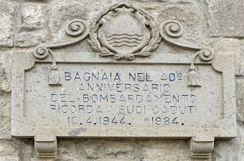 “Il Delegato Commissariale di Bagnaia, inviando un rapporto al Commissario Prefettizio, informa che alle ore 10,00 del 10 aprile 1944, 13 caccia pesanti, provenienti dai Monti Cimini, hanno sganciato circa 20 venti bombe del territorio della frazione…Oltre al bombardamento si è verificato un intenso mitragliamento…
