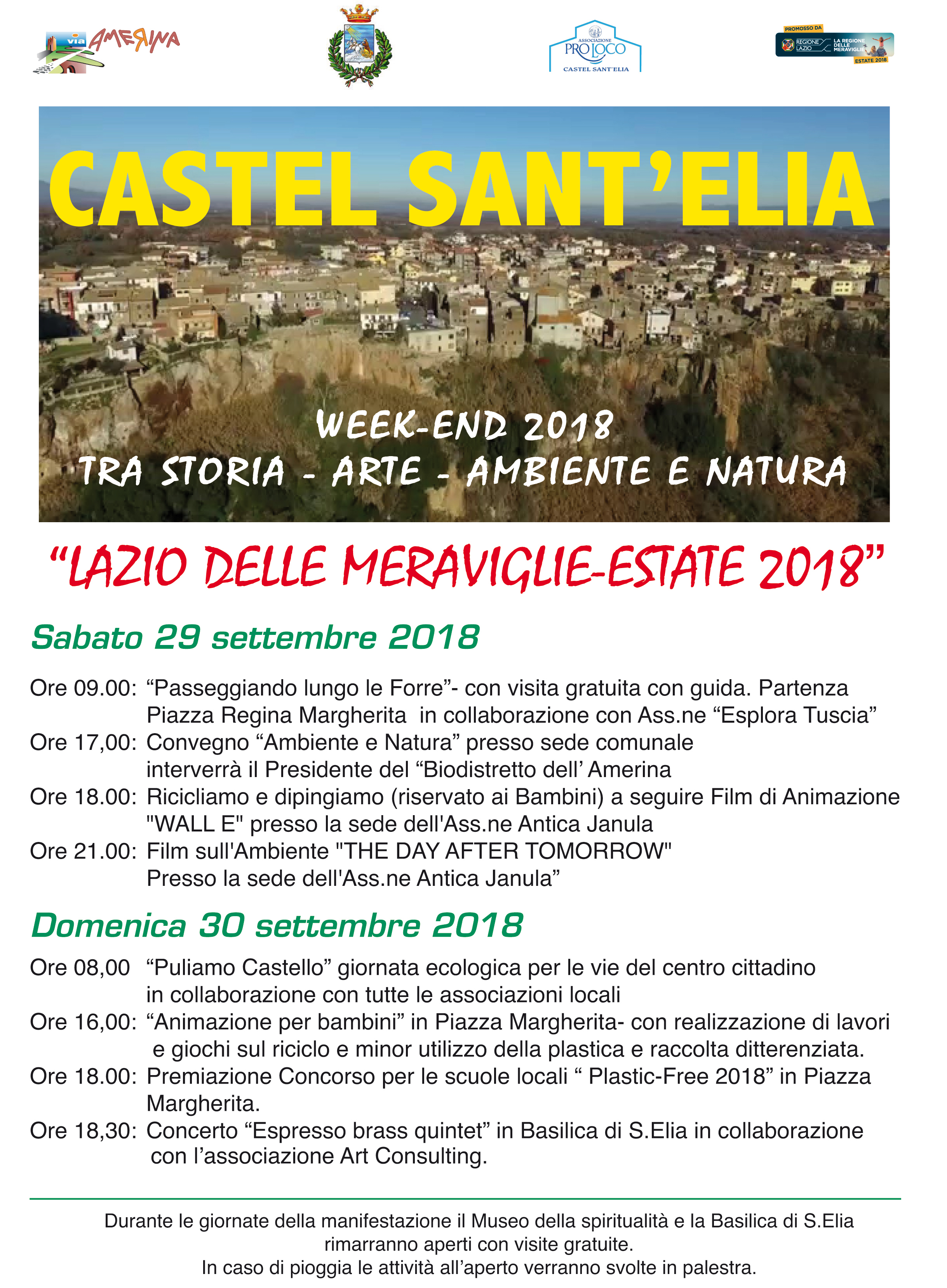 Il Comune di Castel Sant’Elia, in collaborazione con la Proloco organizza per il weekend del 29-30 settembre “ESTATE DELLE MERAVIGLIE”, una due giorni dedicata all’ambiente e alla valorizzazione del territorio. Domenica 30 settembre alle 8.00 Puliamo il Mondo a seguire alle 16.00 animazione in piazza e premiazione miglior opera di riciclo, concorso promosso dal Comune, e alle 18.30 concerto in Basilica.