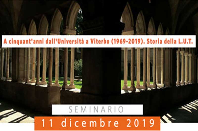 L’11 dicembre dalle ore 9.30 presso l’Aula Magna dell’Università degli Studi della Tuscia si terrà il seminario A cinquant’anni dall’Università a Viterbo (1969-2019). Storia della L.U.T. promosso dal Dipartimento di scienze umanistiche, della comunicazione e del turismo (DISUCOM) in collaborazione con il Polo Umanistico-Sociale del Sistema Bibliotecario di Ateneo. Parteciperanno il rettore dell’Università degli Studi della Tuscia, Stefano Ubertini, il direttore del DISUCOM, Giovanni Fiorentino, il sindaco di Viterbo Giovanni Arena, il sindaco di Vetralla, Francesco Coppari. Sono previste le testimonianze di numerosi protagonisti dell’epoca e l’intervento di studiosi dell’ateneo viterbese sulla storia della Libera Università della Tuscia
