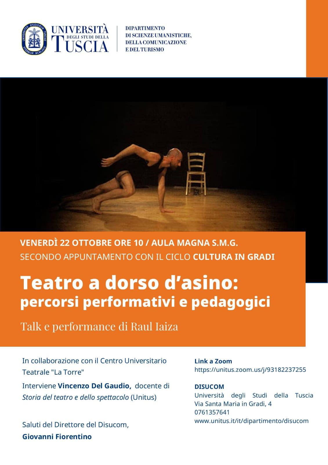 Venerdì 22 ottobre alle ore 10.00. presso l’Aula Magna del Complesso di Santa Maria in Gradi, si terrà il secondo appuntamento del ciclo “Cultura in Gradi”, promosso dal DISUCOM (Dipartimento di Scienze Umanistiche, della Comunicazione e del Turismo) dell’Università degli Studi della Tuscia. Protagonista di questo appuntamento sarà Raul Iaiza, regista e pedagogo argentino del “Regula Contra Regolam Teatro” di Milano, invitato a Viterbo dal Centro Universitario Teatrale “La Torre” per un seminario di approfondimento che si terrà dal 21 al 24 ottobre: dopo i saluti istituzionali del Direttore del Dipartimento prof. Giovanni Fiorentino, il docente di Storia del Teatro e dello Spettacolo Vincenzo del Gaudio dialogherà con Iaiza, prima di lasciare spazio a una performance dal titolo “A DORSO D’ASINO, L’ELOQUENZA ovvero Altri Medioevi: Un recital sulle vie del Volgare”.