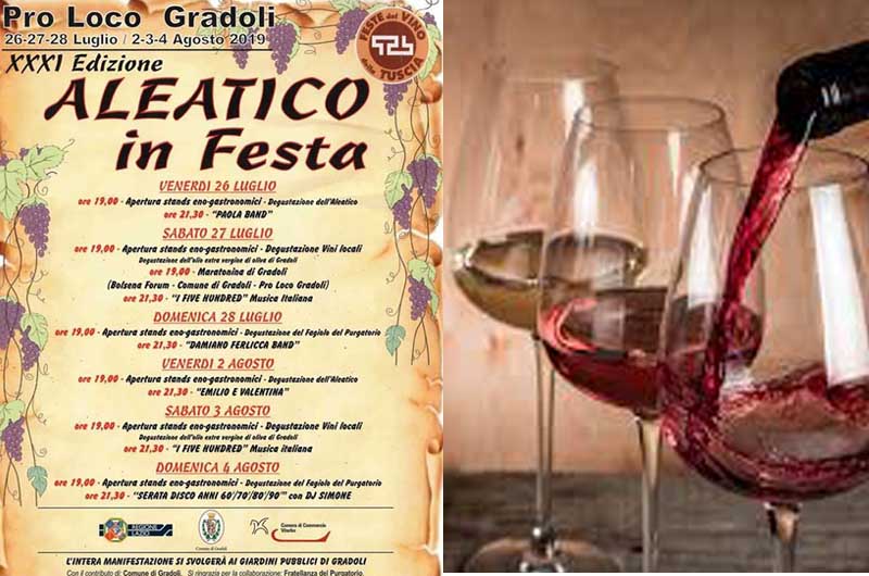 Trentunesimo edizione della festa per  L’Aleatico di Gradoli il  vino DOC la cui produzione è il distinguo della Tuscia Per valorizzare questo prodotto di qualità la Proloco del paese organizza una manifestazione tutto dedicata alla preziosa bevanda Aleatico in festa. Dal 26 luglio al 4 agosto, due weekend di degustazione, musica, eventi.Tutte le sere alle ore 19.00 apertura stands con degustazione dell’Aleatico. Tutto il programma si svolge ai giardini pubblici di Gradoli