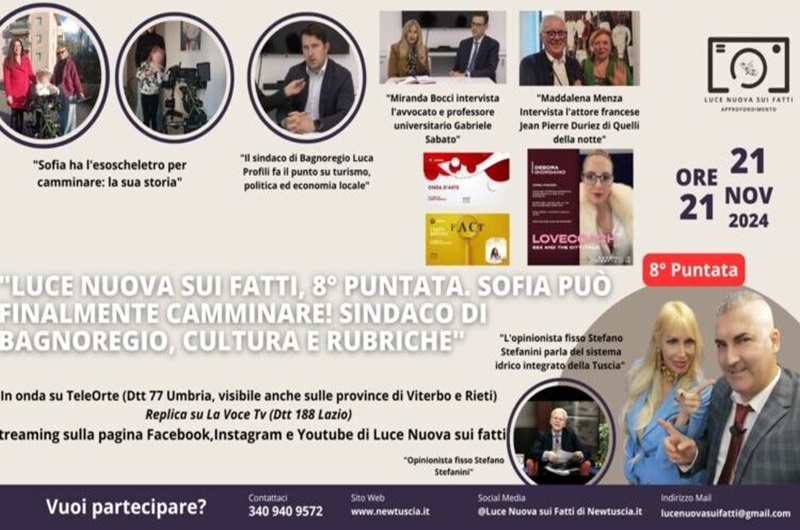 Ottava puntata della quinta edizione di Luce Nuova sui fatti: appuntamento per il 21 novembre alle 21 sui canali social facebook, instagram e Youtube e, in Tv, su TeleOrte (Dtt 77 Umbria, visibile anche dalle province di Viterbo e Rieti).