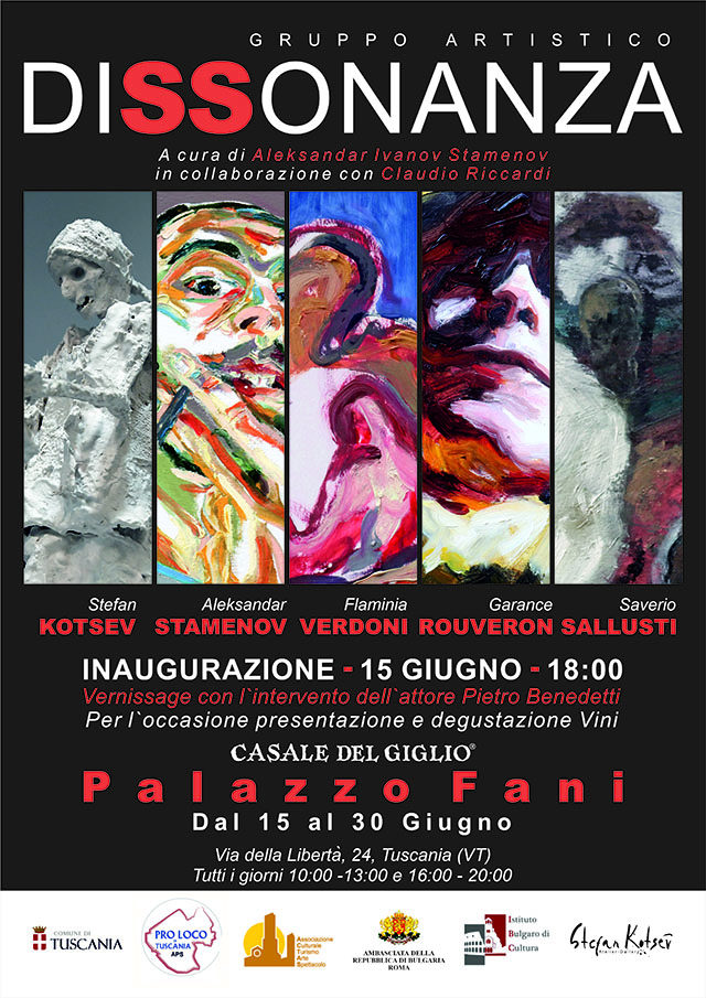 Palazzo Fani, dalle 18.00 alle 20.00, apre al pubblico Dissonanza, prima mostra dell’omonimo collettivo internazionale formato dallo scultore bulgaro Stefan Kotsev, dalla pittrice francese Garance Rouveron, dagli artisti romani Saverio Sallusti e Flaminia Verdoni e da Aleksandar Stamenov, pittore bulgaro naturalizzato italiano, curatore della mostra in collaborazione con Claudio Riccardi.