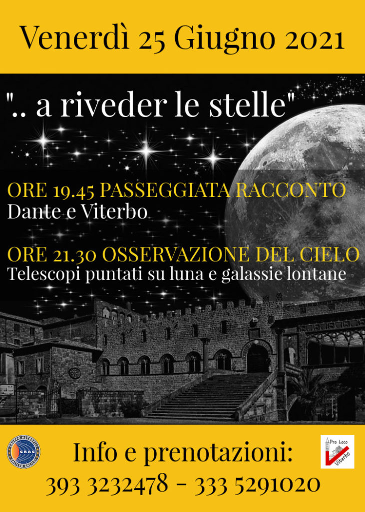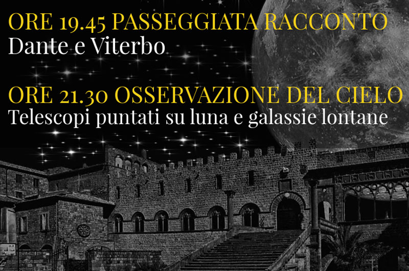 Venerdì 25 giugno tornano gli appuntamenti estivi serali alla scoperta e riscoperta della città di Viterbo e non solo. Alle 19.45 dall’Info Point della pro loco di Viterbo in via San Lorenzo partirà una suggestiva passeggiata guidata sui luoghi di Dante a Viterbo. Ci faranno compagnia, dall’Inferno al Paradiso, Guido di Monfort, il Conte Ugolino e Ruggero della Gherardesca, Papa Martino IV e il suo amore per le anguille del lago di Bolsena, Giovanni XXI, “l’ispanico”, nonché l’unico Papa che Alighieri colloca nel Paradiso della sua Commedia, e tanti altri luoghi e personaggi legati alla nostra città e alla nostra terra. Giungeremo poi in un posto suggestivo, a ridosso delle mura del centro storico dove, grazie alla collaborazione con il Gruppo Astrofili di Viterbo e all’ausilio di telescopi professionali, alzeremo gli occhi al cielo per scrutare luna, stelle, galassie lontane e raccontare brani di affascinante mitologia celeste. Una serata suggestiva e unica per godere della bellezza della nostra città in un modo assolutamente piacevole e diverso riappropriandoci della notte…
