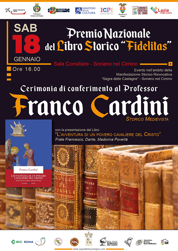 Appuntamento sabato 18 gennaio, alle ore 16.00 presso la Sala consiliare del Comune di Soriano nel Cimino, per il conferimento del prestigioso premio allo storico medievista Prof. Franco Cardini. Per l’occasione sarà presentata l’opera, vincitrice del premio, dal titolo “L’avventura di un povero cavaliere del Cristo” sototitolo: Frate Francesco, Dante, Madonna Povertà .Figlio, santo, poeta, cavaliere, riformatore. San Francesco è stato tutto questo e anche molto di più: senza dubbio la più grande figura religiosa e spirituale della storia italiana. Come in un caleidoscopio, la sua vita ci permette di comprendere meglio gli uomini e le donne del medioevo.