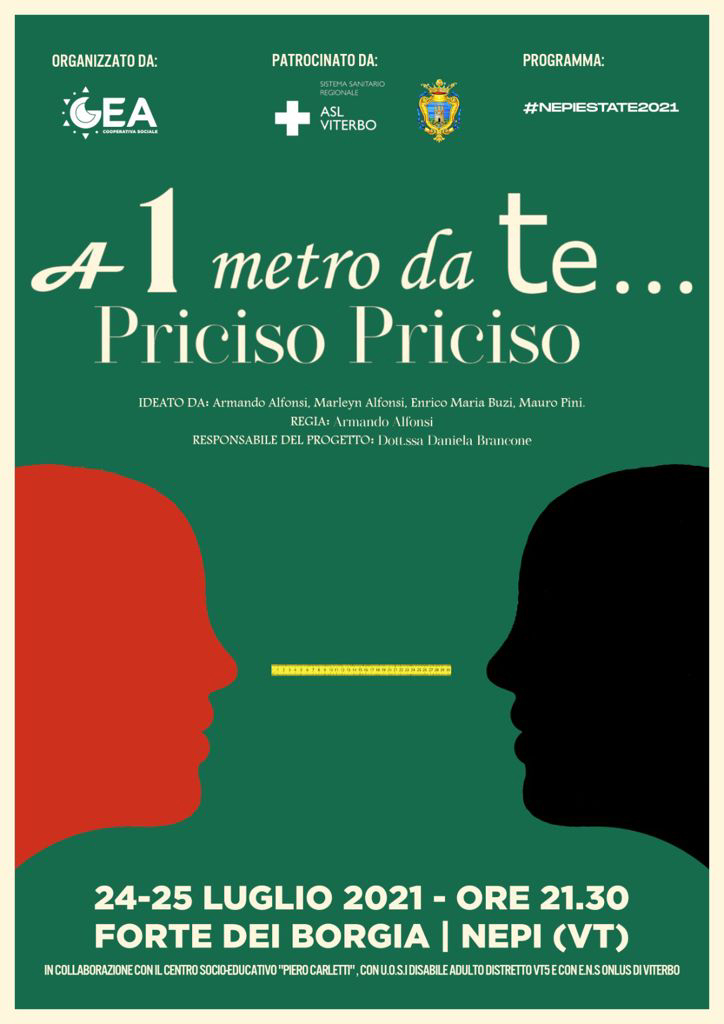 I protagonisti sono sempre loro, i ragazzi del Centro Socio Educativo “Piero Carletti” di Nepi e dei programmi PAI, che questa volta saranno alle prese con uno spettacolo dal titolo “A un metro da te…Priciso Priciso”, che rivisita in maniera ironica le vicissitudini quotidiane che ognuno di noi si è trovato ad affrontare in tempi di covid e lockdown, lasciando spazio ad importanti e profonde riflessioni. L’evento gode del patrocinio del Comune di Nepi e della Asl di Viterbo, con la collaborazione dell’Ens-Sezione Provinciale di Viterbo e dell’U.O.S.I Disabile Adulto del Distretto VT5, e si inserisce all’interno della rassegna“Nepi Estate 2021” promossa dal Comune e dalla Pro Loco.