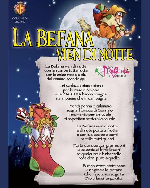 La sera del 5 gennaio le vie di Vejano si riempiranno di magia: la Racchia accompagnerà la Befana con musica e allegria per la tradizionale consegna delle calze ai bambini!
