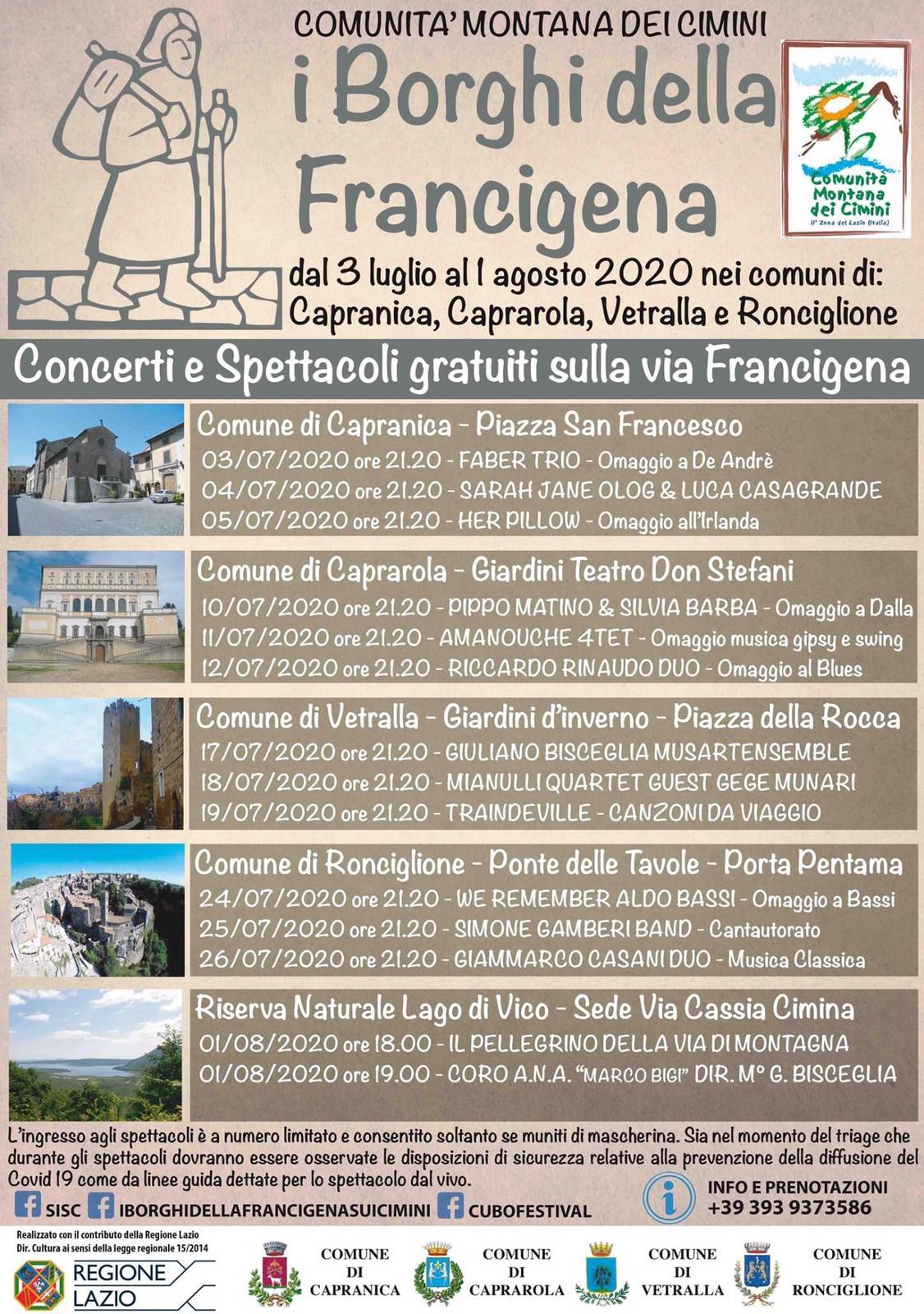 A questo progetto, oltre al Comune di Vetralla, partecipano i Comuni di Capranica, Caprarola, Ronciglione. Si potrà assistere agli spettacoli con posti distanziati e in tutta sicurezza, in linea con le norme anti Covid. Si ringrazia  per la collaborazione la Pro Loco di Vetralla e l’Associazione “I Diavoli della Tuscia”.