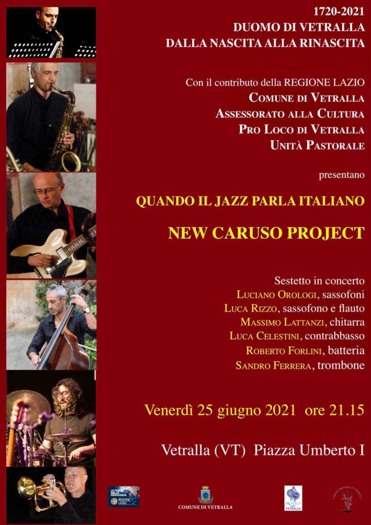 Venerdì 25 giugno alle ore 21.15 a Vetralla in piazza Umberto I si terrà il concerto dei New Caruso Jazz Project, band nata nel 2015 e composta da musicisti eccezionali, come: Luciano Orologi (sassofono), Luca Rizzo (sassofono e flauto), Massimo Lattanzi (chitarra), Luca Celestini (contrabbasso), Roberto Forlini (batteria) e Sandro Ferrera (trombone). Il loro repertorio ripropone musica cantautoriale italiana, rivisitata in versione jazz-strumentale, fra i brani più apprezzati: “La canzone di Marinella” di Fabrizio De André, “L’ultimo bacio” di Carmen Consoli, “Mi sono innamorato di te” di Luigi Tenco e “Napul’è” di Pino Daniele, soltanto per citarne alcuni.
