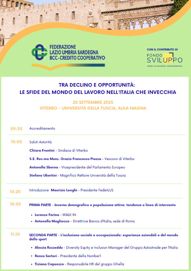 Sabato 20 settembre, dalle ore 9.30, a Viterbo, presso l’Università della Tuscia, è in programma il convegno organizzato da FederLUS-Federazione delle banche di credito cooperativo del Lazio Umbria Sardegna, dedicato alle sfide del mondo del lavoro e al problema demografico.